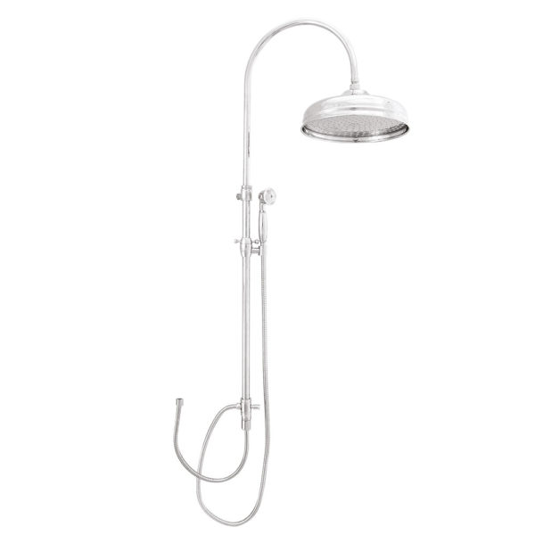 Colonna doccia in ottone ad altezza regolabile , soffione anticalcare, flessibile anti-torsione cm 150 e doccetta anticalcare in ottone. Predisposta per collegamento a miscelatore esterno con flessibile cm 60